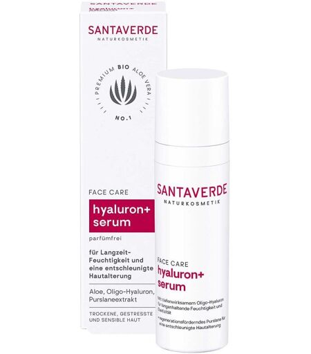 Anwendungsgebiet von Santaverde Hyaluron+ SerumSantaverde Hyaluron+ Serum für Langzeit-Feuchtigkeit und mehr Elastizität mit reinem Bio-Aloe Saft, Oligo-Hyaluron und Purslane-Extrakt für feuchtigkeitsarme, gestresste und sensible Haut. Fördert die Hautregeneration.Wirkstoffe / Inhaltsstoffe / Zutaten Inhaltsstoffe von Santaverde Hyaluron+ Serum : Aloe Barbadensis Leaf Juice*, Ribes Nigrum Twigs/ Buds Water*, Pentylene Glycol, Prunus Amygdalus Dulcis Oil*, Isoamyl Laurate, Hydrolyzed Sodium Hyaluronate, Lactobacillus/Portulaca Oleracea Ferment Extract, Leuconostoc/Radish Root Ferment Filtrate, Lactobacillus, Tocopherol, Chondrus Crispus Powder, Helianthus Annuus Seed Oil, Cocos Nucifera Fruit Extract, p-Anisic Acid, Glyceryl Caprylate, Xanthan Gum, Glyceryl Stearate, Sodium Stearoyl Glutamate, Sodium Cetearyl Sulfate, Sodium Phytate, Aqua, Alcohol.: