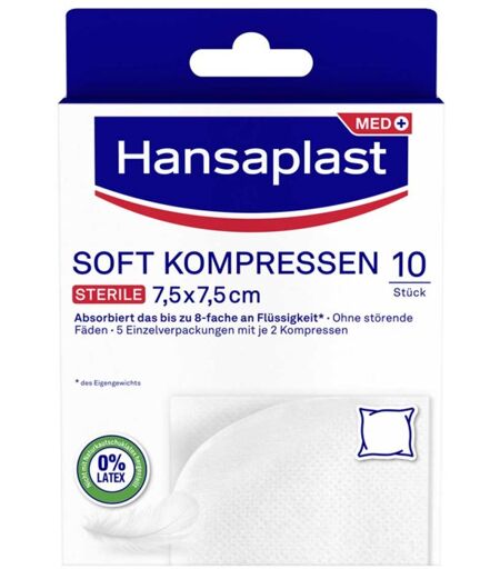 Anwendungsgebiet von Hansaplast Soft Kompressen 7,5x7,5 cm SterilHansaplast Sterile Soft Kompresse – Sanfte und sterile WundversorgungDie Hansaplast Soft Kompressen 7,5x7,5 cm Steril sind ideal zur Reinigung, Abdeckung und postoperativen Wundversorgung. Hergestellt aus einem sanften, atmungsaktiven Material, schützen sie die Wunde zuverlässig und bieten eine weich gepolsterte Auflage.Dank ihrer hohen Saugfähigkeit helfen sie dabei, die Wunde sauber und trocken zu halten und unterstützen so den Heilungsprozess.Produktvorteile:Steril – für hygienische und sichere WundversorgungSanft – besonders hautfreundliches MaterialAtmungsaktiv – unterstützt die natürliche WundheilungAbsorbierend – hält die Wunde trocken und sauberHansaplast Sterile Soft Kompressen – für eine sanfte und sichere Wundversorgung!DosierungAnwendung von Hansaplast Soft Kompressen 7,5x7,5 cm Steril:Wunde reinigen – mit Hansaplast Wundspray oder einem geeigneten Desinfektionsmittel.Haut vorsichtig trocknen – mithilfe der sterilen Kompresse.Kompresse auf die Wunde legen und mit einem Fixierpflaster oder einer Fixierbinde befestigen.Täglich wechseln, um eine optimale Wundheilung zu gewährleisten.Hansaplast Soft Kompressen 7,5x7,5 cm Steril können in Ihrer Versandapotheke www.apotheke.at erworben werden. ...