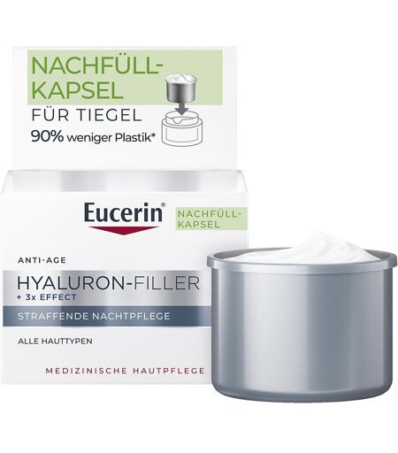 Anwendungsgebiet von Eucerin Anti-Age Hyaluron-Filler Nacht NachfüllkapselEucerin® Hyaluron-Filler + 3x Effect Straffende Nachtpflege Nachfüllkapsel, 50 ml – Anti-Aging Creme für die NachtDie Eucerin Anti-Age Hyaluron-Filler Nacht Nachfüllkapsel ist eine hochwirksame Anti-Aging Nachtcreme zur sichtbaren Milderung selbst tiefer Falten. Die Hautpflege kombiniert hochkonzentrierte Hyaluronsäure mit Glycin-Saponin zur Förderung der natürlichen Hyaluron- und Kollagensynthese. Dexpanthenol unterstützt gezielt den Regenerationsprozess während des Schlafs.Die Gesichtspflege wirkt glättend, feuchtigkeitsspendend und straffend – für ein frisches, erholtes Hautbild am Morgen. Die parfümfreie, nicht komedogene Formel eignet sich für alle Hauttypen und zieht schnell ein. Ideal als tägliche Antifaltencreme im Rahmen der Eucerin® Hyaluron-Filler Pflegeserie. Die innovative Nachfüllkapsel spart 90 % Plastik im Vergleich zum herkömmlichen Tiegel. Die Kapsel ist kompatibel mit allen Eucerin®-Gesichtspflege-Tiegeln – ideal für eine nachhaltige Pflegeroutine.Die Wirksamkeit der Eucerin® Hyaluron-Filler + 3x Effect Nachtpflege wurde in dermatologischen Studien nachgewiesen – mit sehr guter Verträglichkeit.98% bestätigen: Unterstützt die Hautregeneration über Nacht*100% bestätigen: Beugt neuen Falten und feinen Linien vor*100% bestätigen: Sichtbar reduzierte feine Linien und Falten*99% bestätigen: Intensive Pflegewirkung**Anwendungsstudie über 4 Wochen, 120 Teilnehmer:innen, Ergebnisse nach 2- und 4-wöchiger AnwendungWirkstoffe / Inhaltsstoffe / ZutatenEucerin Anti-Age Hyaluron-Filler Nacht Nachfüllkapsel enthält: Wirkstoffe: Hyaluronsäure, Glycin-Saponin, DexpanthenolAqua, Glycerin, Butyrospermum Parkii Butter, Isopropyl Palmitate, Panthenol, Caprylic/Capric Triglyceride, Cetyl Alcohol, Glyceryl Stearate Citrate, Hydrogenated Coco-Glycerides, Octyldodecanol, Stearyl Alcohol, Butylene Glycol, Hydroxypropyl Star ...