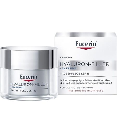 Anwendungsgebiet von Eucerin Anti Age Hyaluron-Filler Tagespflege Creme Normale/MischhautEucerin® Hyaluron-Filler + 3x Effect Tagespflege LSF 15 für normale Haut und Mischhaut 50 ml – Anti-Aging Creme mit HyaluronsäureDie Eucerin Anti Age Hyaluron-Filler Tagespflege Creme Normale/Mischhaut wurde speziell für die Bedürfnisse normaler bis Mischhaut entwickelt. Die Antifaltencreme mit Hyaluronsäure spendet intensive Feuchtigkeit und mildert feine Linien sichtbar. Antioxidatives Glycin-Saponin regt die hauteigene Hyaluron- und Kollagenproduktion an und stärkt die Hautstruktur nachhaltig.Dank LSF 15 mit UVA-Schutz schützt die schnell einziehende, nicht komedogene Feuchtigkeitscreme zuverlässig vor lichtbedingter Hautalterung. Sie eignet sich ideal für die tägliche Gesichtspflege und als Grundlage unter Make-up – für ein sichtbar glatteres, jugendlicheres Hautbild.Die Wirksamkeit der Eucerin® Hyaluron-Filler + 3x Effect Tagespflege LSF 15 für normale bis Mischhaut wurde in dermatologischen Studien bestätigt – mit hervorragender Verträglichkeit.100% bestätigen: Reduziert sichtbar feine Linien und Falten*100% bestätigen: Die Haut wird spürbar straffer*100% bestätigen: Die Haut fühlt sich verjüngt an*98% bestätigen: Glättet die Haut spürbar**Anwendungsstudie über 4 Wochen, 100 Teilnehmer:innen, Ergebnisse nach 2- und 4-wöchiger AnwendungWirkstoffe / Inhaltsstoffe / ZutatenEucerin Anti Age Hyaluron-Filler Tagespflege Creme Normale/Mischhaut enthält: Wirkstoffe: Hyaluronsäure, Glycin-Saponin, EnoxolonAqua, Glycerin, Octyldodecanol, Cetearyl Alcohol, Methylpropanediol, Butylene Glycol, GlycerylStearate Citrate, Caprylic/Capric Triglyceride, Behenyl Alcohol, Butyl Methoxydibenzoylmethane,Hydroxypropyl Starch Phosphate, Phenylbenzimidazole Sulfonic Acid, Dicaprylyl Ether, ButyleneGlycol Dicaprylate/Dicaprate, Bis-Ethylhexyloxyphenol Methoxyphenyl Triazine, DistarchPhosphate, Ethylhexyl Triazone, Sodiu ...