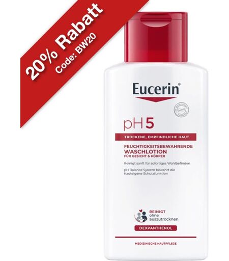 Die Produkte der pH5-Serie schützen die Haut vor dem Austrocknen, unterstützen die langanhaltende Befeuchtung und lassen sie weich und geschmeidig aussehen.Wirkungsweise von Eucerin pH5 Waschlotion empfindliche HautEmpfindliche, trockene Haut neigt dazu, besonders auf Umweltreize mit Spannungsgefühl, Hautrötungen und –irritationen zu reagieren. Daher braucht strapazierte Haut eine besonders milde Reinigung, die die physiologische Balance der Haut aufrechterhält.