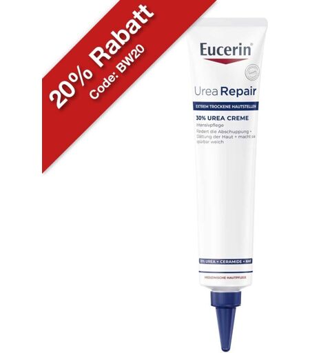 Anwendungsgebiet von Eucerin UreaRepair Plus 30% Urea Creme Die Eucerin UreaRepair Plus 30% Urea Creme ist eine Hautpflege für die kurzzeitige Anwendung auf hyperkeratotischen Hautarealen zur Reduktion der verdickten und schuppenden Haut. Wenn die schützende Hautbarriere gestört ist trocknet die Haut an beanspruchten Stellen besonders schnell aus und wird rau, schuppt und längerfristig auch verdickt. Dies kann besonders Hautareale betreffen, die einer hohen Belastung ausgesetzt sind, wie Ellenbogen, Hände, Knie und Füße. Hier unterstützt die Creme die Haut mit der intensiven Pflege, die sie braucht.
