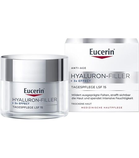 Anwendungsgebiet von Eucerin Anti Age Hyaluron-Filler Tagespflege Creme trockene HautEucerin® Hyaluron-Filler + 3x Effect Tagespflege LSF 15 für trockene Haut, 50 ml – Anti-Falten-Pflege mit HyaluronsäureDie Eucerin Anti Age Hyaluron-Filler Tagespflege Creme trockene Haut für trockene Haut bietet eine gezielte Anti-Aging-Wirkung und versorgt feuchtigkeitsarme Haut intensiv. Die Antifaltencreme kombiniert hochkonzentrierte Hyaluronsäure mit Glycin-Saponin, um feine Linien sichtbar zu glätten und die Hautstruktur nachhaltig zu verbessern.Mit Lichtschutzfaktor 15 und UVA-Filter schützt die Feuchtigkeitscreme effektiv vor vorzeitiger Hautalterung. Die leichte, schnell einziehende Gesichtspflege eignet sich ideal für trockene Haut und hinterlässt ein angenehm glattes Hautgefühl. Auch als Make-up-Unterlage geeignet.Die Wirksamkeit der Eucerin® Hyaluron-Filler + 3x Effect Tagespflege LSF 15 für trockene Haut wurde in dermatologischen Studien bestätigt – bei sehr guter Verträglichkeit.99% bestätigen: Reduziert sichtbar feine Linien und Falten*100% bestätigen: Die Haut fühlt sich straffer an*100% bestätigen: Verjüngt das Aussehen der Haut*100% bestätigen: Glättet die Haut für ein ebenmäßigeres Aussehen*98% bestätigen: Beugt der Neuentstehung von Falten und feinen Linien vor**Anwendungsstudie über 4 Wochen, 120 Teilnehmer:innen, Ergebnisse nach 2- und 4-wöchiger AnwendungWirkstoffe / Inhaltsstoffe / ZutatenEucerin Anti Age Hyaluron-Filler Tagespflege Creme trockene Haut enthält: Wirkstoffe: Hyaluronsäure, Glycin-Saponin, EnoxolonAqua, Glycerin, Butylene Glycol Dicaprylate/Dicaprate, Ethylhexyl Salicylate, Butylene Glycol,Glyceryl Stearate Citrate, Hydrogenated Coco-Glycerides, Butyrospermum Parkii Butter, ButylMethoxydibenzoylmethane, Ethylhexyl Triazone, Methylpropanediol, Bis-EthylhexyloxyphenolMethoxyphenyl Triazine, Cetyl Alcohol, Hydroxypropyl Starch Phosphate, Stearyl Alcohol,Phenylbenzimi ...