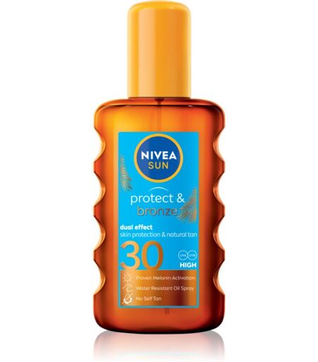 NIVEA SUN Protect & Bronze, 200 ml, Schutz vor Sonnenstrahlung für Damen, Schützen Sie Ihre Haut vor Sonnenbrand, vorzeitiger Hautalterung und anderen durch Sonneneinstrahlung verursachten Schäden. Das Sonnenschutzmittel NIVEA SUN Protect & Bronze bildet einen wirksamen Schutzschild gegen UV-Strahlen. Es schützt die Haut nicht nur vor Pigmentierung und Sonnenbrand, sondern auch Elastizitäts- und Kollagenverlust, sowie weiteren Zeichen der Hautalterung. Dadurch wird auch das Hautkrebsrisiko erheblich gesenkt. Eigenschaften: schützt die Haut vor UVA und UVB-Strahlen spendet der Haut die nötige Feuchtigkeit ist leicht aufzutragen und hinterlässt keinen Fettfilm auf der Haut beschleunigt den natürlichen Bräunungsprozess das Präparat ist wasserfest Anwendung: Sprühen Sie vor dem Sonnenbad eine feine Schicht auf die Haut des ganzen Körpers. Nach Bedarf wiederholen, vor allem nach dem Baden, dem Abtrocknen mit einem Handtuch oder bei übermäßigem Schwitzen. ...