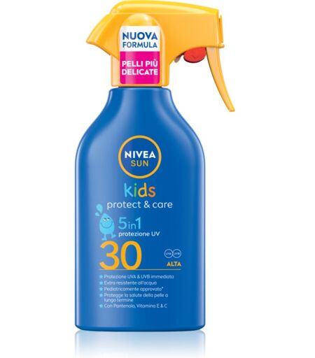 NIVEA SUN Kids, 270 ml, Sonnenschutzmittel für Kinder für Kinder, Die Haut von Kindern reagiert extrem empfindlich auf Sonnenstrahlen und muss daher ausreichend und zuverlässig geschützt werden. Dafür sorgt das Sonnenschutzmittel NIVEA SUN Kids. Dank einer Kombination aus wirksamen UV-Filtern beugt es Irritationen, Sonnenbrand und anderen durch Sonnenlicht verursachten Schäden vor. Gleichzeitig sorgt die speziell auf die Bedürfnisse von Kindern entwickelte Formulierung für eine sanfte Pflege, die selbst für die empfindlichste Haut geeignet ist. Eigenschaften: schützt die Haut vor UVA und UVB-Strahlen verhindert ein Austrocknen schont empfindliche Kinderhaut das Präparat ist wasserfest Anwendung: Sprühen Sie vor dem Sonnenbad eine ausreichend große Menge auf die Haut. Wiederholen Sie dies vor und nach dem Baden, nach dem Abwischen oder nach dem Abtrocknen mit einem Handtuch. ...
