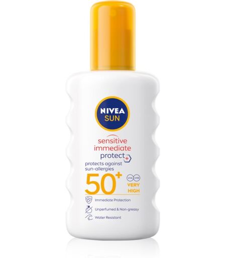 NIVEA SUN Protect & Sensitive, 200 ml, Schutz vor Sonnenstrahlung für Damen, Schützen Sie Ihre Haut vor Sonnenbrand, vorzeitiger Hautalterung und anderen durch Sonneneinstrahlung verursachten Schäden. Das Sonnenschutzmittel NIVEA SUN Protect & Sensitive bildet einen wirksamen Schutzschild gegen UV-Strahlen. Es schützt die Haut nicht nur vor Pigmentierung und Sonnenbrand, sondern auch Elastizitäts- und Kollagenverlust, sowie weiteren Zeichen der Hautalterung. Dadurch wird auch das Hautkrebsrisiko erheblich gesenkt. Eigenschaften: schützt die Haut vor UVA und UVB-Strahlen ist leicht aufzutragen und hinterlässt keinen Fettfilm auf der Haut beschleunigt den natürlichen Bräunungsprozess spendet der Haut die nötige Feuchtigkeit das Präparat ist wasserfest Zusammensetzung: ist nicht parfümiert Anwendung: Sprühen Sie vor dem Sonnenbad eine feine Schicht auf die Haut des ganzen Körpers. Nach Bedarf, vor allem nach dem Baden, nach dem Schwitzen oder Abtrocknen mit einem Handtuch, wiederholen. ...