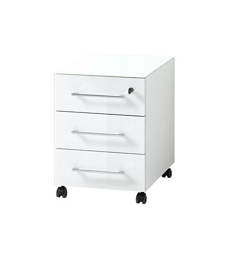 GERMANIA Monteria Rollcontainer weiß 3 Auszüge 40,0 x 50,0 x 55,0 cm – Qualität, die hält, was sie versprichtDer GERMANIA Monteria Rollcontainer weiß 3 Auszüge 40,0 x 50,0 x 55,0 cm macht an Ihrem Arbeitsplatz garantiert eine gute Figur und bietet zusätzlichen Stauraum. Er ist der perfekte Aufbewahrungsort für Dokumente und Utensilien, die Sie griffbereit haben möchten. Aufgrund der Rollen an der Unterseite ist er zudem jederzeit leicht an den Wunschort zu verschieben. Die integrierte Feststellbremse verhindert ein ungewolltes Wegrollen.Woraus besteht dieses Möbelstück?Beachten Sie auch die erstklassigen Materialien, die dieses Möbelobjekt auszeichnen, dazu gehört auch deren Herstellungsart. Sie erhalten einen Artikel mit einer beständigen Qualität, denn der Korpus ist aus Holz gefertigt. Die unempfindliche Oberfläche mit Melaminharzbeschichtung, Glas ist einfach zu säubern und schützt vor Schrammen und Feuchtigkeit. Sowohl Korpus als auch Schubladen haben die Farbe Weiß. Das wirkt in jedem Büro sehr stylisch und attraktiv.Wie sind die Griffe gestaltet?Anhand der praktischen Relinggriffe lässt sich das Möbelstück schnell und einfach öffnen und schließen. Die Griffe bestehen aus Metall.Ideale SchubladenausstattungDas Möbelobjekt bietet 3 Auszüge und insgesamt folgende Aufteilung: 3 Schubladen. So erhalten Sie viel Möglichkeiten mit System zur Ablage Ihrer Akten. Die Schubladen sind aus Spanplatte, Glas gefertigt. Die Auszugssperre vermeidet das gleichzeitige Öffnen mehrerer Schubladen sowie das komplette Herausziehen der einzelnen Schübe. So wird die Kippgefahr des Möbelobjekts und das Herausfallen der Schubladen gebannt. Mit einer Auszugsöffnung von bis zu 75% können Sie die Schubladen optimal nutzen.Folgende Verschlussart hat dieses ModellUm den Inhalt vor unerlaubtem Zugriff zu schützen, ist ein Schub abschließbar. Diese Eigenschaften hat das Modell zudem: Schubladen mit Selbsteinzug, Fronten und Abdeckung aus Sicherheitsglas.Erfahren Sie mehr über die HauptmerkmaleAus folgenden Werten setzen sich die wichtigsten Maße zusammen: Breite: 40,0 cmTiefe: 50,0 cmHöhe: 55,0 cmDas Exemplar hat ein Gewicht von 21,0 kg. Dieses "Made in Germany"-Produkt zeugt von hohem Qualitätsstandard.Wünschen Sie mehr Einrichtungsmöglichkeiten aus dieser Möbelserie?Sie erhalten weitere dazugehörige Elemente im Stil der Möbelserie Monteria hier im Shop. Schauen Sie gleich mal nach, womit Sie Ihre Räumlichkeiten ausstatten können!Die passende Ausstattung für Ihr Büro?Bleiben Sie flexibel und ordern Sie den GERMANIA Monteria Rollcontainer weiß 3 Auszüge 40,0 x 50,0 x 55,0 cm doch einfach hier bei uns online! ...