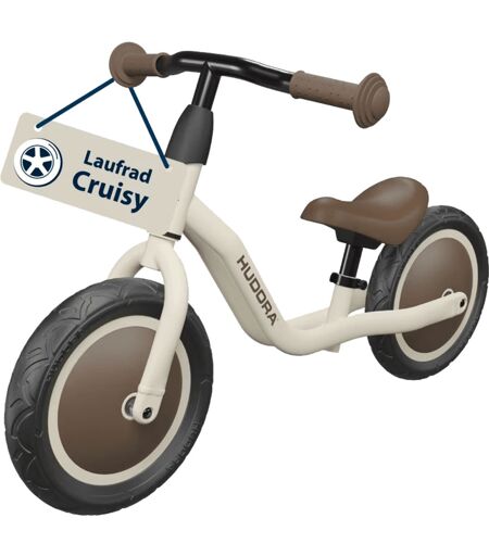 Beim Laufrad Cruisy von HUDORA kommen Retro-Look und simple Funktionalität schön zusammen. Stabil verarbeitet und leicht zu lenken, gelingen darauf die ersten Fahrversuche fast wie von allein. Verantwortlich dafür: Die „Anti-Shaking-Geometrie“. Bedeutet: Ein extra langer Radstand und der breite Lenker sorgen für reichlich Stabilität und eine hohe Laufruhe. Kein Zufall, denn Cruisy gehört zu unserer neuesten Laufrad-Generation, die wir zusammen mit Eltern und Kindern in Deutschland entwickelt haben. Auf dem neuen Cruisy sind Kids zwischen 18 Monaten und 4 Jahren maximal flexibel unterwegs. Dank größerem Vorderrad rollt man über kleinere Hindernisse spielend hinweg. Das Wichtigste bei einem Laufrad ist jedoch die Sattelhöhe. Diese ist beim Cruisy verstellbar und lässt sich so perfekt an die aktuelle Körpergröße anpassen. Das gibt den Kleinen von Beginn an ein sicheres Fahrgefühl. Mit dem extra-tiefen Einstieg ist das Laufrad außerdem so konstruiert, dass selbst die Jüngsten mühelos aufsteigen und gleich loscruisen können – ideal für einen gelungenen Start in die Welt des Radfahrens. ...