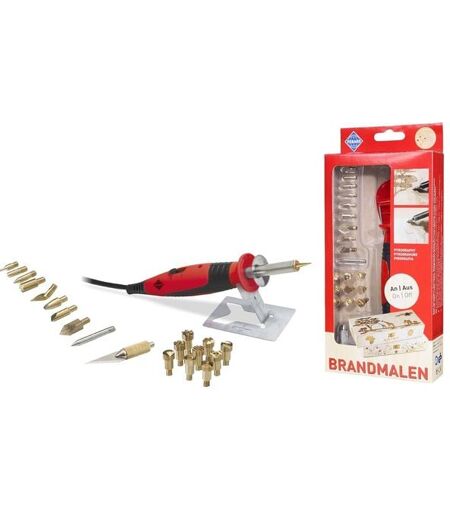 Handlicher Brandmalkolben mit Ein und Aus Schalter am Handstück und insgesamt 20 Aufsätzen Mit unserem Brandmalkolben entstehen die schönsten Kunstwerke auf Holz, Leder oder Kork. Die Motive werden in das Material eingebrannt. Durch unsere große Auswahl an verschiedenen Aufsätzen wie Brennspitzen, Brennschleifen und Brennstempeln können viele Motive eingebrannt werden. Die Brandmalerei ist somit für Erwachsene und Kinder gleichermaßen geeignet. Inhalt: - Brandmalkolben An/Aus - Auflageböckchen - 9 Brennspitzen - 9 Brennstempel - Lötspitze (Art. 20153) - Styropormesser (Art. 20171) - Gebrauchsanweisung ...