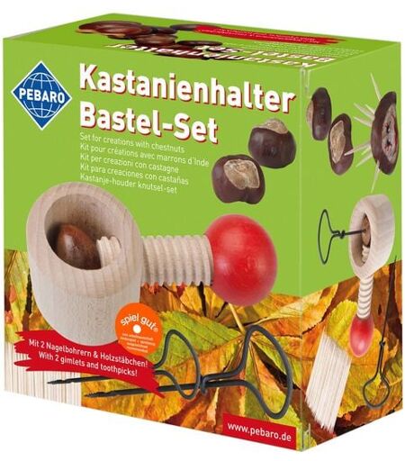 Set zum Basteln mit Kastanien. Inhalt: Halter für Kastanien Nagelbohrer 2 mm Nagelbohrer 3 mm 190 Zahnstocher Gebrauchsanweisung verpackt im Buntkarton Mit unserem Kastanienhalter Bastel-Set gestalten Sie ganz einfach lustige Tiere und Kastanienmännchen und das ohne Verletzungsgefahr, denn die Kastanien werden in den Schraubstock gespannt und schon können ganz einfach Löcher in die Kastanie gebohrt werden. Zahnstocher werden hineingesteckt und so entstehen die Arme und Beine der Figuren. Das Kastanienhalter Bastel-Set ist mit dem spiel gut-Siegel ausgezeichnet und ist somit besonders gut für Kinder geeignet. ...