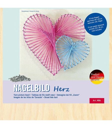 Nagelbild Herz Inhalt: 15 mm Pappelsperrholz 20 x 20 cm mit Druck inkl. Nägel So gehts: Nägel in vorgedruckte Punkte einschlagen. Das Garn mit einem Knoten am Nagel befestigen. Zuerst den Faden an der Außenlinie entlang legen. Innenbereich ausfüllen, indem der Faden kreuz und quer gespannt wird. Zum Schluss das Fadenende an einem Nagel festknoten. ...