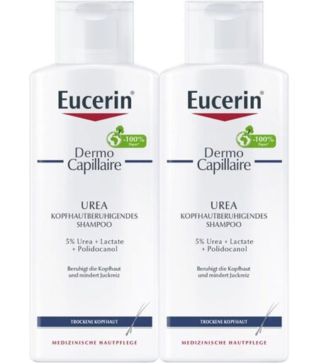 Anwendungsgebiet von Eucerin DermoCapillaire Urea Kopfhautberuhigendes Shampoo DoppelpackEucerin® DermoCapillaire Urea Kopfhautberuhigendes Shampoo – Beruhigt trockene und juckende Kopfhaut , 2 x 250 ml.Das Eucerin DermoCapillaire Urea Kopfhautberuhigendes Shampoo Doppelpack pflegt trockene Kopfhaut, mildert Juckreiz und schützt vor Irritationen. In der Formel der Haarpflege sind die hauteigenen Feuchthaltefaktoren Urea und Lactat enthalten, welche den Feuchtigkeitsverlust der Kopfhaut reduzieren und damit auch gegen Spannungsgefühle sowie schuppige Haut wirken. In Kombination mit dem Juckreiz-mindernden Polidocanol wird der Zustand der Kopfhaut spürbar verbessert und das natürliche Gleichgewicht wiederhergestellt. Kopfhaut und Haar werden damit sanft und schonend gereinigt – für gepflegtes Haar mit einem gesunden Glanz. Mit der milden Formel ohne Duftstoffe eignet sich das Shampoo auch für empfindliche Hauttypen, die zu Neurodermitis oder Psoriasis neigen. Wirkungsweise von Eucerin DermoCapillaire Urea Kopfhautberuhigendes Shampoo DoppelpackSie leiden unter einer juckenden, spannenden Kopfhaut? Eucerin DermoCapillaire Urea Kopfhautberuhigendes Shampoo Doppelpack versorgt Ihre Haut durch Urea und Lactat mit reichhaltiger Feuchtigkeit und wirkt durch das enthaltene Polidocanol hautberuhigend. Der unangenehme Juckreiz wird bereits ab der ersten Anwendung gelindert. Zudem wird Ihr Haar wieder seidig weich und glänzend. Eucerin DermoCapillaire Urea Kopfhautberuhigendes Shampoo Doppelpack ist auch zur Anwendung bei Psoriasis oder Neurodermitis geeignet.Wirkstoffe / Inhaltsstoffe / ZutatenInhaltsstoffe von Eucerin DermoCapillaire Urea Kopfhautberuhigendes Shampoo Doppelpack: