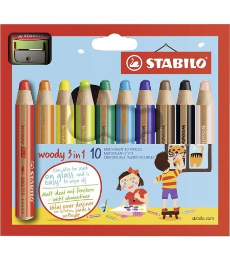 STABILO Buntstift, Wasserfarbe & Wachsmalkreide - woody 3 in 1 - 10er Pack mit Spitzer - mit 10 verschiedenen Farben