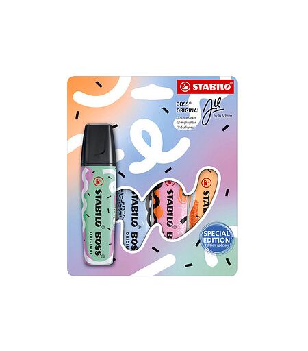 STABILO BOSS ORIGINAL by Ju Schnee Textmarker farbsortiert, 4 St. – für die schnelle TextmarkierungAuffallende Farben machen den Unterschied – mit den STABILO BOSS ORIGINAL by Ju Schnee Textmarkern farbsortiert, 4 St. erhalten Sie interessante Farbtöne, mit denen Sie Ihre markierten Notizen zum Strahlen bringen. Die speziellen Farbtöne sorgen dafür, dass wichtige Informationen sofort ins Auge springen und im Gedächtnis bleiben.Große Palette an Farben zur AuswahlDie Farben mint, wolkenblau, fuchsia und orange sind vielseitig einsetzbar und hinterlassen immer einen markanten Eindruck. Sie können das Modell locker und unverkrampft greifen, da die Griffzone ergonomisch geformt ist.Mit Keilspitze für variable StricheBei der Spitze handelt es sich um eine Keilspitze, die zudem leicht abgeschrägt ist. Je nachdem, wie der Stift gehalten wird, verändert sich die Strichbreite. Die Spitze kann einen Strich in folgender Stärke erzeugen: 2,0 - 5,0 mm.Non-permanent und wasserlöslichDas Produkt gehört in die Kategorie non-permanent und die Tinte kann deshalb problemlos wieder von glatten Flächen weggewischt werden. Das funktioniert z.B. mit einem feuchten Tuch.NachfüllbarBei hohem Bedarf müssen Sie nicht immer ein neues Produkt kaufen, denn dieses Modell ist praktischerweise nachfüllbar. Für alle, die der Abfallproblematik entgegenwirken wollen, ist dies eine gute Alternative. Im Vergleich ist das außerdem oft kostengünstiger als ein neues Produkt.In Nullkommanix trockenDie schnelle Trocknung der Tinte verhindert jede Art von Schmiererei. Linkshänder profitieren davon erheblich.LichtbeständigDie Farbe ist lichtbeständig, sodass Sie auch nach längerer Zeit nicht die Farbintensität verliert.KopierbarNoch ein wichtiger Punkt: Die Tinte ist schattenfrei kopierbar, auch bei Schwarz-Weiß-Kopien.Eintrocknen ist kein ThemaEs kann durchaus vorkommen, dass der Stift – z.B. während der Analyse des Textes – ohne Verschluss liegen bleibt. Dies hat 4 Stunden keinerlei Auswirkung auf die Funktionstüchtigkeit und sorgt nicht etwa für ein Eintrocknen der Tinte.Ergänzen Sie Ihre Farbpalette!Für eine gute Verarbeitung und Haltbarkeit spricht, dass es sich hier um ein Produkt "Made in Germany" handelt. Bestellen können Sie die STABILO BOSS ORIGINAL by Ju Schnee Textmarker farbsortiert, 4 St. ganz bequem hier bei uns im Online-Shop – so haben Sie immer ein perfektes Hilfsmittel zur Hand! ...