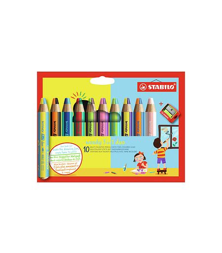 Für bunte Kunstwerke – die 10 STABILO woody 3 in 1 Malsets farbsortiertDa kreative Betätigung gerade in jungen Jahren besonders wichtig ist, sind Sie mit den 10 STABILO woody 3 in 1 Malsets farbsortiert für Ihren Nachwuchs bestens ausgestattet. Die bunte Vielfalt und die kräftigen Farben inspirieren zum Malen, Zeichnen und Basteln. Da der Artikel für Kleinkinder geeignet ist, können auch schon die ganz Kleinen damit malen.Große Auswahl für großes MalvergnügenFreuen Sie sich auf die Farben gelb/cyanblau, orange/schwarz, ultramarinblau/türkis, STABILOrot/dunkelgrün, hellgrün/braun, pink/erika, türkis/hellgrün, gelb/violett, orange/mittelblau, weiß/apricot, die hervorragend decken und mit denen bestimmt tolle Kreationen gelingen. Im Set enthalten sind 10 Stifte.Runder Schaft für eine gute HaptikDank ihrer ergonomischen und gleichmäßig runden Form liegen die 10 STABILO woody 3 in 1 Malsets farbsortiert gut in der Hand. Die Finger nehmen eine leichte und lockere Haltung ein, sodass unverkrampftem Malen nichts im Wege steht. Besonders kleine Kinder profitieren von der dicken Ausführung des Schafts und können ihn prima greifen.Mit besonders stabiler MineWenn die Spitzen immer wieder abbrechen, ist das ein lästiges Übel. Das Produkt überzeugt jedoch mit einer hohen Minenstabilität und Bruchfestigkeit und garantiert einen sorglosen Mal- und Zeichenspaß.Hört sich gut an, richtig?Bei Bestellung der 10 STABILO woody 3 in 1 Malsets farbsortiert erhalten Sie Ihre Lieferung inklusive Spitzer. ...