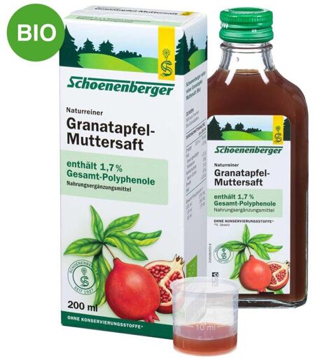 Anwendungsgebiet von Schoenenberger Naturreiner Granatapfel-MuttersaftSchoenenberger Naturreiner Granatapfel-Muttersaft ist ein unverfälschter, natürlicher Saft, der aus hochwertigen Granatäpfeln gewonnen wird und 1,7 % Gesamt-Polyphenole enthält. Polyphenole sind bekannt für ihre antioxidativen Eigenschaften, die helfen können, freie Radikale im Körper zu neutralisieren und somit die Zellen vor oxidativem Stress zu schützen.Wirkstoffe / Inhaltsstoffe / ZutatenZutaten von Schoenenberger Naturreiner Granatapfel-Muttersaft :