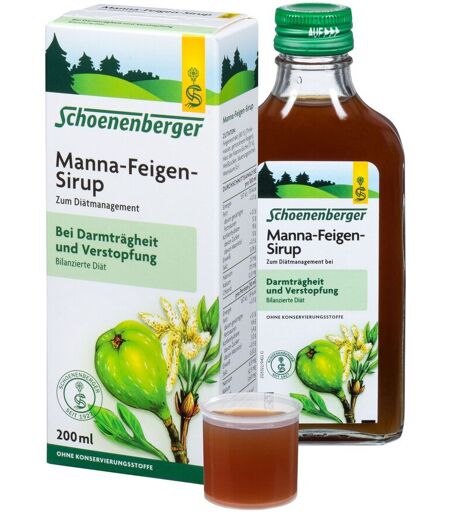 Bitte achten Sie auf eine abwechslungsreiche und ausgewogene Ernährung und gesunde Lebensweise.Schoenenberger® Manna-Feigen-SirupLebensmittel für besondere medizinische Zwecke (bilanzierte Diät)Zum Diätmanagement bei Darmträgheit und VerstopfungSirup aus echtem, natürlichem Manna und einem wässrigen Extrakt aus getrockneten FeigenManna besteht zu einem hohen Anteil aus Mannitol, einem Zuckeralkohol, der aufgrund seiner wasserbindenden Eigenschaft den Stuhl weicher machen kannAuch in der Schwangerschaft und für Kinder geeignetBei Manna-Feigen-Sirup handelt es sich um ein Lebensmittel für besondere medizinische Zwecke (Bilanzierte Diät), geeignet zum Diätmanagement bei Darmträgheit und Verstopfung. Dieser Sirup ist ein pflanzliches Produkt aus echtem, natürlichem Manna und einem wässrigen Extrakt aus getrockneten Feigen.Die diätetische Eignung beruht auf der Verwendung von Manna.Manna besteht zu einem hohen Anteil aus Mannitol, einem Inhaltsstoff, der aufgrund seiner wasserbindenden Eigenschaft den Stuhl weicher machen kann.Dieser Sirup liefert pro Verzehrseinheit (30 ml) 2,4 g Mannitol, die individuelle Dosis kann je nach Befinden und Verträglichkeit eingestellt werden.Darüber hinaus enthält der Sirup zur geschmacklichen Abrundung natürliche Inhaltsstoffe aus der getrockneten Feige.Manna-Feigen-Sirupdient dem Diätmanagement von Darmträgheit und Verstopfung auf eine milde Weise und ist daher auch in der Schwangerschaft und für Kinder geeignet.Es sollte während der Anwendung auf eine reichliche Flüssigkeitszufuhr geachtet werden, z. B. Mineralwasser, Tee oder Schoenenberger Gemüsesäfte.Hilfreiche Hinweise, um Ihren Darm zu normaler Funktion zu erziehen:Ballaststoffreiche Mischkost (z. B. Gemüse, Salate, Vollkornbrot und Vollkornerzeugnisse)Ausreichende Flüssigkeitszufuhr (1,5 bis 2 Liter täglich)Möglichst viel Bewegung (insbesondere bei sitzender Berufsausübung).Keine Unterdrückung des Stuhlgangs.Bedenken Sie ferner, dass eine 2- bis 3-malige Stuhlentleerung pro Woche durchaus normal sein kann und noch nicht bedeutet, dass Sie aus medizinischer Sicht Verstopfung haben.Schoenenberger wurde bereits 1998 erstmals und inzwischen mehrfach mit dem EG-Öko-Audit für praktizierten Umweltschutz ausgezeichnet.Zutaten:Feigenextrakt (80 %) (Trinkwasser, getrocknete Feigen), Manna (13 %) Saccharose, Säuerungsmittel: Weinsäure (L+).Manna-Feigen-Sirup ist frei von Konservierungsmitteln* und ohne Alkohol*.*) lt. GesetzNährwerte:Nährwertangaben Tagesdosis pro100 ml30 mldavon gesättigte Fettsäuren< 0,1 g< 0,1 gdavon mehrwertige Alkohole8 g2,4 gdavon Zucker20 g5,9 gEiweiß< 0,5 g< 0,5 gEnergie529 kJ / 126 kcal159 kJ / 38 kcalFett< 0,5 g< 0,5 gKohlenhydrate33 g9,8 gSalz0,08 g0,02 gVitamine / Mineralstoffe Tagesdosis pro100 ml30 mlCalcium11,5 mg3,44 mgEisen0,4 mg0,1 mgKalium178 mg53,6 mgKupfer40 µg12 µgMagnesium9,26 mg2,78 mgMangan0,05 mg0,02 mgNatrium30,6 mg9,17 mgPhosphor11,4 mg3,43 mgZink0,1 mg0,03... ...
