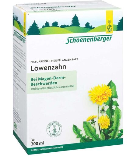 Anwendungsgebiet von Schoenenberger Naturreiner Heilpflanzensaft LöwenzahnDer Schoenenberger Naturreiner Heilpflanzensaft Löwenzahn bietet eine natürliche und effektive Unterstützung bei verschiedenen gesundheitlichen Beschwerden. Dieser Saft zeichnet sich durch seine hohe Qualität und Wirksamkeit aus. Der Löwenzahn wird seit Jahrhunderten in der Medizin für seine gesundheitsfördernden Eigenschaften geschätzt.Wirkungsweise von Schoenenberger Naturreiner Heilpflanzensaft LöwenzahnSchoenenberger Naturreiner Heilpflanzensaft Löwenzahn besteht zu 100 % aus Heilpflanzen, die aus kontrolliert biologischem Anbau stammen. Es werden keine Zusätze wie Zucker, Alkohol oder Konservierungsstoffe verwendet, was das Produkt besonders rein und verträglich macht. Der hohe Gehalt an Bitterstoffen im Löwenzahn unterstützt die Bildung von Speichel, Magensäure und Gallensaft und fördert so die Verdauung und lindert Beschwerden im Magen-Darm-Bereich.Wirkstoffe / Inhaltsstoffe / ZutatenSchoenenberger Naturreiner Heilpflanzensaft Löwenzahn enthält: