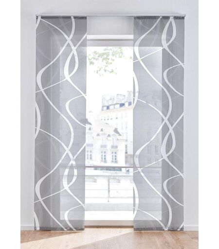 Moderne Schiebegardine aus halbtransparenter Stoffqualität. Das stilvolle Muster ist durch das Scherli-Verfahren hergestellt und hat somit trendige fransige Kanten. Erhältlich in verschiedenen attraktiven Wohnfarben. ...
