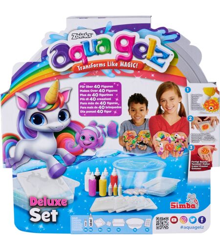 Mit Aqua Gelz von Simba entstehen individuell gestaltete Soft-Figuren in 3D. Dafür werden die Farbgele in Formen gegeben und anschließend in ein Wasserbad getaucht. Dadurch verwandelt sich das Gel innerhalb von Sekunden von einem flachen Motiv in eine 3D-Figur. Dieses Set beinhaltet 9 Flaschen Farbgel mit Basisfarben, Glitzerfarben und Farben mit Glow in the Dark Effekt sowie eine Schale, 6 Formen und 6x Wasserzusatz. Jede Menge Material für jede Menge Kreativität! ...