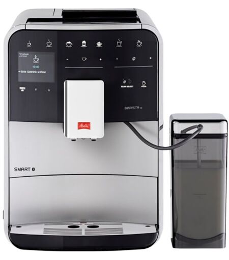 Die Melitta Barista TS Smart ist ein Kaffeevollautomat und überzeugt durch hohen Bedienkomfort. Dank der Direktbezugstasten lassen sich die 4 Klassiker Espresso, Caffè Crema, Cappuccino und Latte Macchiato mit nur einem Tastendruck beziehen. Außerdem lassen sich 17 weitere Kaffeevariationen zubereiten, z.B. Flat White, Ristretto, Americano oder Espresso Doppio. Die innovative Touch & Slide Funktion ermöglicht jederzeit mittels sanfter Berührung der Sensorfelder ein einfaches und komfortables Bedienen. Separate Düsen für Kaffee, Milch und Heißwasser sorgen für eine einfache Zubereitung der Lieblingsgetränke ohne Verschieben der Tasse. Zudem ist der Auslauf bis 140 mm höhenverstellbar, sodass auch hohe Latte Macchiato-Gläser ihren Platz finden. Der innovative Automatic Bean Select wählt aus dem Zweikammern-Bohnenbehälter automatisch oder nach Wunsch die richtige Bohnensorte für den Lieblingskaffee. Die aktive Bohnenüberwachung hilft dabei, einen Leerlauf des Mahlwerks während des Kaffeebezugs zu verhindern und informiert rechtzeitig, sobald Bohnen nachgefüllt werden müssen. Mit der Bean to Cup Funktion wird stets nur die jeweils benötigte Bohnenmenge frisch gemahlen und das Kaffeepulver direkt verarbeitet. Auto Empty Grinding - Das Leermahlen der Mühle sorgt dafür, dass jede Tasse mit frisch gemahlenen Bohnen zubereitet und der Geschmack nicht von Mahlresten getrübt wird. Die spezielle Abdichtung des Aromasafe Deckels bietet Tasse für Tasse ein echtes Frische-Genuss-Erlebnis. Für authentischen Geschmack sorgt der Italian Preparation Process, bei dem die Zutaten nach italienischem Originalrezept in der richtigen Reihenfolge zusammengeführt werden. So wird beim Latte Macchiato der Espresso erst nach Milch und Milchschaum hinzugefügt, beim Cappuccino ist es genau umgekehrt. Die Intense Aroma-Funktion kann anstelle des Standard Brühverfahrens ausgewählt werden. Das Ergebnis ist ein besonders intensiv schmeckender Kaffee – ohne dabei die Kaffee- oder Wassermenge zu verändern. Die Funktion ist für alle Kaffeespezialitäten wählbar. Mit der My Coffee Memory-Funktion lassen sich außerdem Lieblings-Kaffeespezialitäten ganz individuell programmieren. Die Barista TS Smart merkt sich die gewünschten Einstellungen von bis zu acht Personen. Die Melitta Kaffeevollautomaten verfügen neben einem programmierbaren Energiesparmodus über eine praktische Auto-Off-Funktion. Mit ihr lässt sich selbst bestimmen, wann sich der Kaffeevollautomat automatisch abschaltet. Natürlich lässt sich die Barista TS Smart auch manuell über den 0-Watt-Schalter vom Strom trennen. Auch bei Pflege und Reinigung weiß die Barista TS Smart zu überzeugen. Durch die praktische und benutzerfreundliche Entnahme ist die Brühgruppe leicht zu reinigen. Dadurch kann auch der Innenraum der Maschine gesäubert werden. Die Barista TS Smart meldet automatisch im Display, wenn sie gereinigt oder entkalkt werden muss. Mittels verständlicher Textanweisungen wird man Schritt-für-Schritt durch die entsprechenden... ...