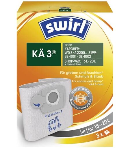 Die Beutel der KÄ-Serie von Swirl wurden speziell für Nass- und Trockensauger entwickelt. Dank reißfestem Vliesmaterial sind sie hervorragend für starke Beanspruchungen geeignet. Die Swirl KÄ 3 Beutel fassen 15-20l und sind passend für Kärcher WD 3, Shop-Vac und weitere Sauger bzw. Marken. Produkteigenschaften Reißfestes Vlies: - Die Swirl KÄ-Beutel halten dank reißfestem Vliesmaterial selbst den stärksten Beanspruchungen stand - z.B. beim Einsaugen von grobem Schmutz oder feuchtem Staub. ; 3-Lagen-Qualität -: Die dreilagige Qualität gewährleistet eine optimale Filtration und Saugleistung während der Benutzung. ; Praktischer Staubverschluss -: Der Staubverschluss verhindert, dass Schmutz und Staub entweichen, damit der volle Beutel sauber und bequem entsorgt werden kann. ; Universal-Halteplatte -: Die universale Halteplatte ist passend für alle Nass- und Trockensauger, deren Stutzen einen Durchmesser von 59-70 mm hat.; Lieferumfang 3er Pack; ...