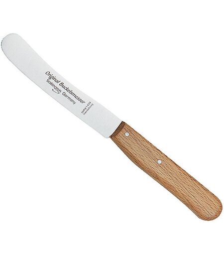 Der Begriff Bucklesmesser steht für ein altdeutsches Frühstücksmesser und blickt auf eine lange Tradition zurück. aus rostfreiem Edelstahl (1.4034) mit extra scharfem Handabzug oval geformte Griffe aus feinstem Buchenholz Länge: 11,5 cm Made in Solingen ...