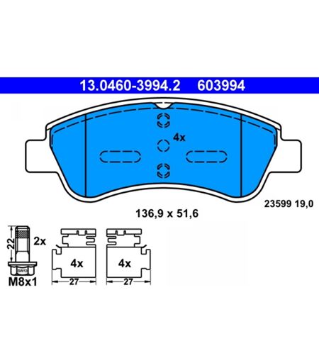 Anzahl der Beläge: 4. Anzahl der federn: 8. Anzahl der schrauben: 2. Anzahl verschleißanzeiger [pro achse]: 2. Breite [mm]: 136,8. Bremssystem: Bosch. Dicke [mm]: 19. Für bremsscheibendurchmesser [mm]: 266. Hersteller: ATE. Herstellernummer: 13.0460-3994.2. Höhe [mm]: 52. Index: 13.0460-3994.2. Material: Low-Metallic. Montage Achse: Vorne. Produktart: Bremsbelagsatz. Typprüfung: E1 90R-01568/550. Verschleißkontakt: Nein. Vorbereitung für Verschleißkontakt: Nein. WVA-Nummer: 23599. ...