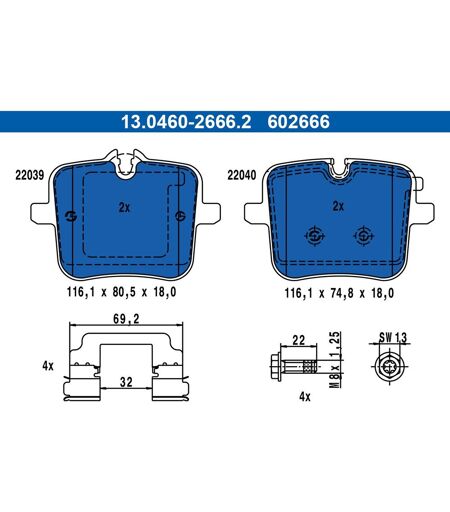 Anzahl der schrauben: 4. Breite [mm]: 116,1. Bremssystem: Lucas / TRW. Dicke [mm]: 18. Hersteller: ATE. Herstellernummer: 13.0460-2666.2. Höhe [mm]: 80,5, 74,8. Index: 13.0460-2666.2. Material: Low-Metallic. Montage Achse: Hinten. Produktart: Bremsbelagsatz. Typprüfung: E9 90R-02A1163/5236. Verschleißkontakt: Nein. Vorbereitung für Verschleißkontakt: Ja. WVA-Nummer: 22039. ...