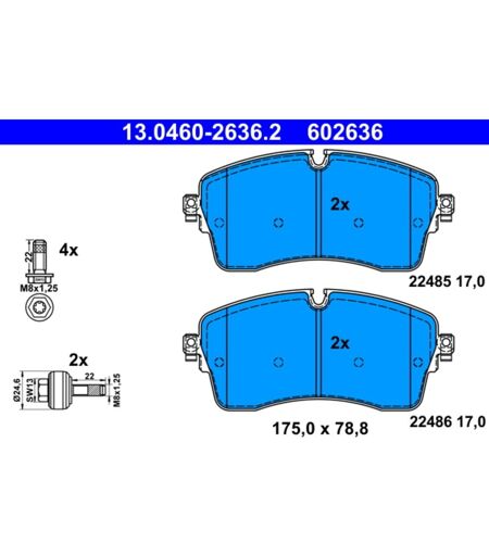 Anzahl der Beläge: 4. Anzahl der federn: 4. Anzahl der schrauben: 6. Breite [mm]: 175. Bremssystem: Lucas / TRW. Dicke [mm]: 17. Für bremsscheibendurchmesser [mm]: 349. Hersteller: ATE. Herstellernummer: 13.0460-2636.2. Höhe [mm]: 78,8. Index: 13.0460-2636.2. Material: Low-Metallic. Montage Achse: Vorne. Produktart: Bremsbelagsatz. Typprüfung: E1 90R-02A0612/0771. Verschleißkontakt: Nein. Vorbereitung für Verschleißkontakt: Ja. WVA-Nummer: 22485 22486. ...