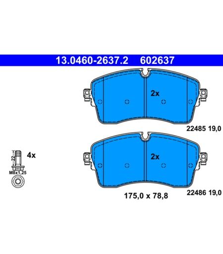Anzahl der Beläge: 4. Anzahl der federn: 4. Anzahl der schrauben: 4. Breite [mm]: 175. Bremssystem: Lucas / TRW. Dicke [mm]: 19. Für bremsscheibendurchmesser [mm]: 349. Hersteller: ATE. Herstellernummer: 13.0460-2637.2. Höhe [mm]: 78,8. Index: 13.0460-2637.2. Material: Low-Metallic. Montage Achse: Vorne. Produktart: Bremsbelagsatz. Typprüfung: E1 90R-02A0612/0771. Verschleißkontakt: Nein. Vorbereitung für Verschleißkontakt: Ja. WVA-Nummer: 22485 22486. ...