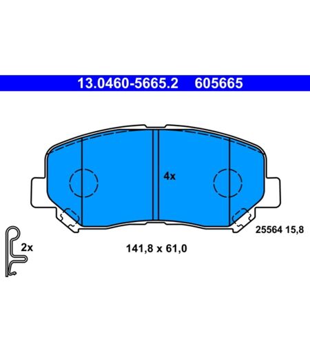 Anzahl der Beläge: 4. Anzahl verschleißanzeiger [pro achse]: 2. Breite [mm]: 141,8. Bremssystem: Akebono. Dicke [mm]: 15,8. Hersteller: ATE. Herstellernummer: 13.0460-5665.2. Höhe [mm]: 61. Index: 13.0460-5665.2. Montage Achse: Vorne. Produktart: Bremsbelagsatz. Typprüfung: E9 90R-02A1279/3455. Verschleißkontakt: Ja. WVA-Nummer: 25564. verschleisskontakttyp: akustisch. ...