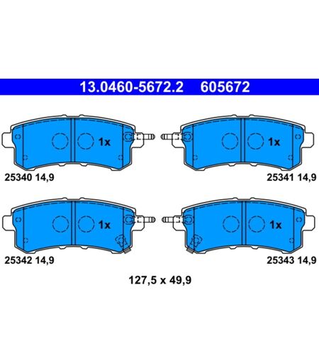 Breite [mm]: 127,5. Bremssystem: ADVICS. Dicke [mm]: 14,9. Hersteller: ATE. Herstellernummer: 13.0460-5672.2. Höhe [mm]: 49,9. Index: 13.0460-5672.2. Montage Achse: Hinten. Produktart: Bremsbelagsatz. Typprüfung: E9 90R-02A1379/3793. Verschleißkontakt: Ja. WVA-Nummer: 25340; 25341; 25342; 25343. verschleisskontakttyp: akustisch. ...
