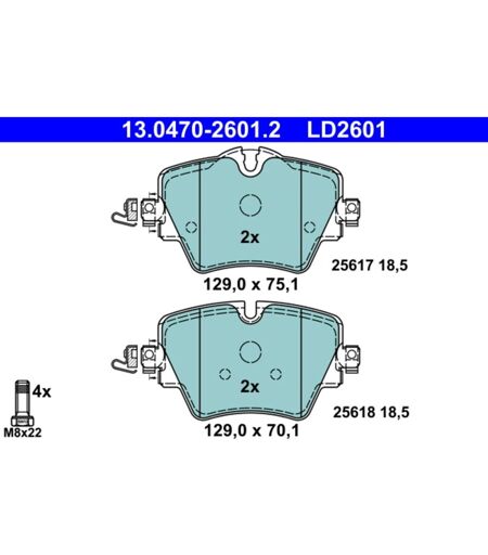 Anzahl der Beläge: 4. Anzahl der schrauben: 4. Breite [mm]: 129. Bremssystem: Lucas / TRW. Dicke [mm]: 18,5. Hersteller: ATE. Herstellernummer: 13.0470-2601.2. Höhe [mm]: 70,1, 75,1. Index: 13.0470-2601.2. Material: Ceramic / Low-Metallic. Montage Achse: Vorne. Produktart: Bremsbelagsatz. Typprüfung: E9 90R-02A1396/4270. Verschleißkontakt: Nein. Vorbereitung für Verschleißkontakt: Ja. WVA-Nummer: 25617; 25618. ...