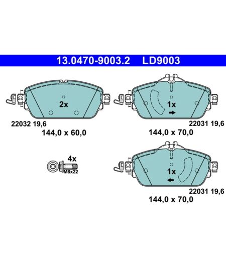 Anzahl der schrauben: 4. Breite [mm]: 144. Bremssystem: Lucas / TRW. Dicke [mm]: 19,6. Hersteller: ATE. Herstellernummer: 13.0470-9003.2. Höhe [mm]: 60, 70. Index: 13.0470-9003.2. Material: Ceramic. Montage Achse: Vorne. Produktart: Bremsbelagsatz. Typprüfung: E1 90R-02A0321/0610. Verschleißkontakt: Nein. Vorbereitung für Verschleißkontakt: Ja. WVA-Nummer: 22031; 22032. ...