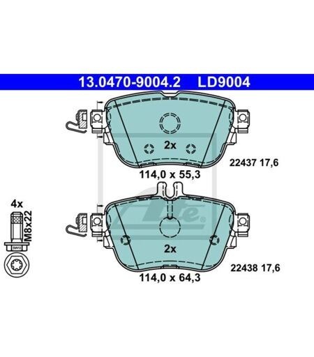 Anzahl der schrauben: 4. Breite [mm]: 114. Bremssystem: Lucas / TRW. Dicke [mm]: 17,6. Hersteller: ATE. Herstellernummer: 13.0470-9004.2. Höhe [mm]: 55,3, 64,3. Index: 13.0470-9004.2. Material: Ceramic. Montage Achse: Hinten. Produktart: Bremsbelagsatz. Typprüfung: E1 90R-02A0321/0611. Verschleißkontakt: Nein. Vorbereitung für Verschleißkontakt: Ja. WVA-Nummer: 22437; 22438. ...
