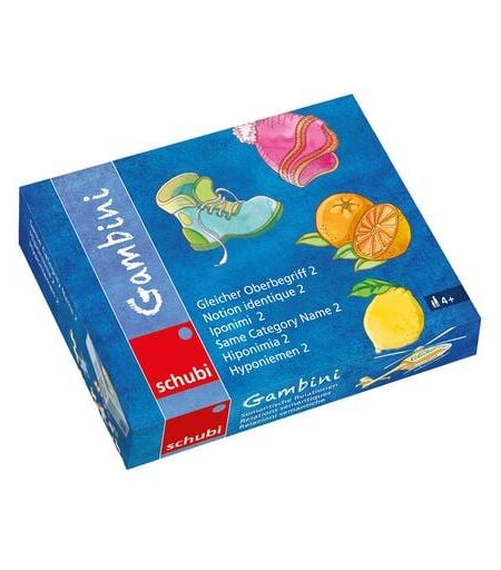"Die Gambini-Spiele greifen das klassische Spielekonzept des Paarefindens auf und bieten dazu abwechslungsreiche Varianten an. Je nach Entwicklungsstand und Unterstützungsbedarf der Kinder kann die sprachliche Aufgabe ausgewählt und variiert werden. Die fantasievoll und kindgerecht gestalteten Karten motivieren die Kinder beim Suchen der Partnerkarten und regen sie zum Sprechen an. Das Kartenmaterial ist vielfältig einsetzbar, wodurch der kindliche Wortschatz auf verschiedenen Ebenen wiederholt, gefestigt und erweitert wird. Dinge, die zur gleichen Kategorie/zum selben Oberbegriff gehören, finden, benennen und sprachlich einander zuordnen. „Was gehört zusammen?"" Kategorien und Motive : Tiere: Affe – Giraffe – Elefant – Löwe • Obst: Banane – Orange – Zitrone – Pfirsich • Gemüse: Kartoffel – Zwiebel – Kohl – Paprika (Pepereroni für CH) • Möbel: Regal – Sessel – Sofa – Spielkiste • Geschirr: Topf – Schüssel – Glas – Brett(chen) • Werkzeug: Taschenmesser (Sackmesser für CH) – Bohrer – Feile – Schraubenzieher • Kleidung: Jacke – Schuh – Mütze – Socke • Spielzeug: Bauklötze – Puzzle – Schaukelpferd – Kaufmannsladen • Fahrzeuge: Fahrrad – Eisenbahn/Zug – Lastwagen – Hubschrauber • Gebäude: Supermarkt – Turm – Schwimmbad – Hochhaus • Körperteile: Hand – Fuß – Auge – Ohr • Wetter: Blitz – Hagel – Nebel – Sturm Inhalt: 4 Spiele mit insgesamt 48 farbigen Bildkarten (12 Oberbegriffe mit je 2 Kartenpaaren) und Anleitung mit Anregungen. Geeignet für: Kinder ab 4 Jahren, Sprachtherapie, Sprachförderung, DaZ, Nachmittagsbetreuung. Für 2-4 Spieler. " ...