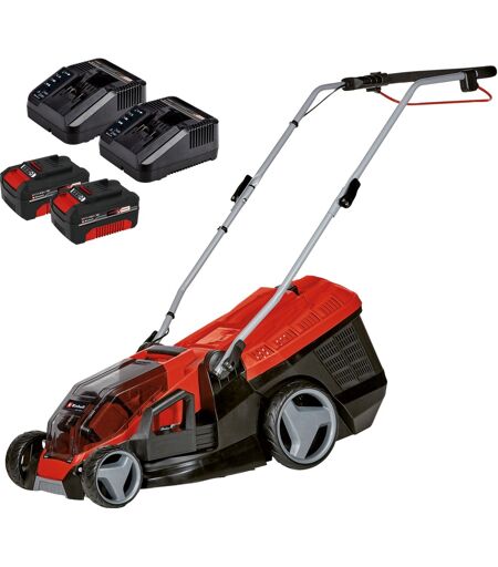 Der Akku-Rasenmäher GE-CM 36/36 Li von Einhell ist ein sehr hochwertiges, zuverlässiges und leistungsstarkes Gerät zum kabellosen Mähen. Der Highwheeler wird von einem Einhell Brushless Motor, einem bürstenlosen Elektromotor, angetrieben und arbeitet mit zwei 18 Volt Akkus des neuen Power X-Change Batteriesystems von Einhell. Das sorgt für angenehmes Arbeiten ohne lästiges Stromkabel. Die sechsstufige zentrale Schnitthöhenverstellung erlaubt die einfache Einstellung der Schnitthöhe von 25 bis 75mm. Der GE-CM 36/36 Li ist mit einem klappbaren und dreifach höhenverstellbaren Führungsholm mit Schnellspannhebeln ausgestattet und kann so platzsparend verstaut werden. Seine großflächigen Räder schonen zudem den Rasen beim Mähen. Der 40 Liter fassende Grasfangkorb ist mit einer Füllstandanzeige ausgestattet, so dass man sofort sieht, wann eine Leerung erforderlich wird. Ein praktischer Tragegriff sorgt für einfachen Transport. Der GE-CM 36/36 Li wird für Rasenflächen bis 400m² empfohlen. ...