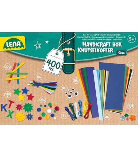 LENA® Bastelkoffer, blau. Der Bastelkoffer enthält buntes Papier, Moosgummiteile, Pfeifenreiniger, Wackelaugen, Pompons, bunte Eisstiele und vieles mehr in verschiedenen Blau- und Grün-Farbtönen. 400 Teile. Geeignet für Kinder ab 5 Jahren. Verpackt in Faltschachtel mit Produktinformationen. ...