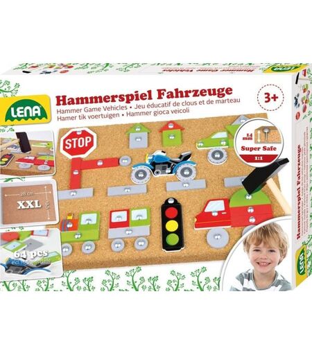 LENA® Hammerspiel Fahrzeuge. Farbenfrohe Motive selbst gestalten. Inhalt: 48 bunte Plättchen, 16 bedruckte Sonderteile, Hammer und Nägel sowie Korkplatte: 27 x 20,5 cm. Fördert die Kreativität und Motorik. Geeignet für Kinder ab 3 Jahren. Verpackt in Faltschachtel mit Produktinformationen. ...