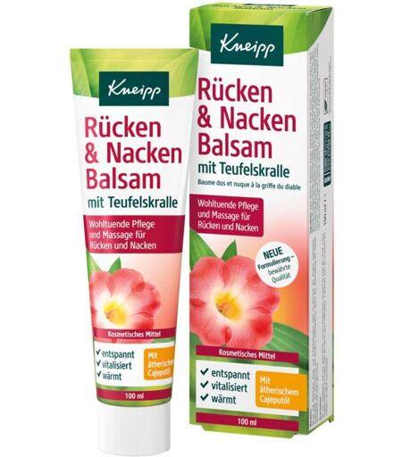 Anwendungsgebiet von Kneipp Rücken & Nacken BalsamKneipp Rücken & Nacken Balsam kann sowohl zur Pflege als auch für eine Massage an Rücken und Nacken verwendet werden, dadurch werden die betroffenen Körperpartien entspannt, vitalisiert, gelockert und gewärmt.Wirkungsweise von Kneipp Rücken & Nacken BalsamKneipp Rücken & Nacken Balsam enthält Teufelskrallenextrakt, natürliches ätherisches Cajeputöl und eine wohlriechende Duftkombination ätherischer Öle, deshalb lässt er sich leicht verteilen und ist gut geeignet bei der Anwendung einer Massage. In Kombination mit einer Massage regt Kneipp Rücken & Nacken Balsam die Durchblutung an und entfaltet einen wohltuenden Wärmeeffekt.Wirkstoffe / Inhaltsstoffe / ZutatenInhaltsstoffe von Kneipp Rücken & Nacken Balsam: