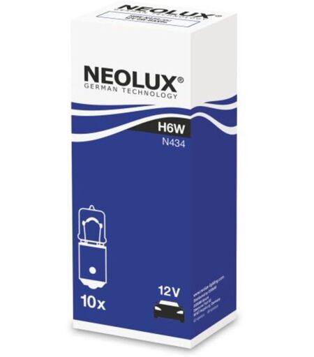 Art der Glühlampe: H6W. Hersteller: NEOLUX. Herstellernummer: NLX434 K10SZT. Index: NLX434 K10SZT. Lampentyp: Sekundär. Nennleistung [W]: 6. Spannung [V]: 12. Steckdosentyp: BAX9S. Stückzahl : 10. Verpackung: Karton. ...