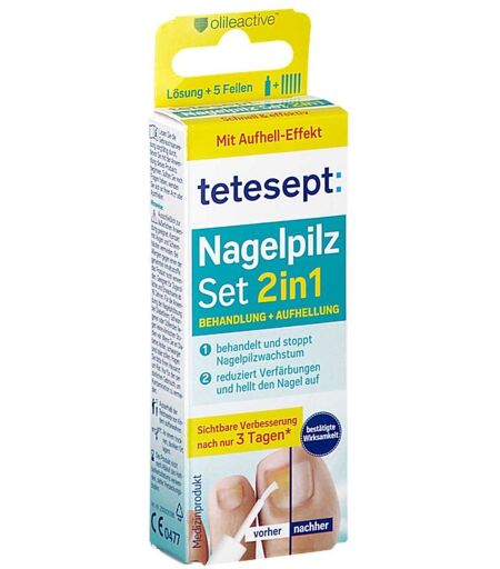 Anwendungsgebiet von Tetesept Nagelpilz Set 2in1Tetesept Nagelpilz Set 2in1 als effektive Hilfe bei NagelpilzinfektionenDas Tetesept Nagelpilz Set 2in1 ist ein speziell entwickeltes Medizinprodukt zur gezielten Behandlung von Nagelpilz. Die enthaltene Lösung mit Olile-Active – einer Wirkstoffkombination aus Olivenblättern und Algen – entzieht dem Pilz die Lebensgrundlage, sodass er weder überleben noch sich ausbreiten kann. Gleichzeitig sorgt die innovative Formulierung in Tetesept Nagelpilz Set 2in1 für eine sichtbare Aufhellung des Nagels und reduziert unschöne Verfärbungen. Erste Verbesserungen sind bereits nach nur drei Tagen der Anwendung erkennbar.*Was ist Nagelpilz?Nagelpilz (Onychomykose) ist eine Infektion des Nagelkeratins, die durch Pilzerreger verursacht wird. Während die Erkrankung oft als kosmetisches Problem betrachtet wird, kann sie unbehandelt zu Beschwerden wie Schmerzen, Reizungen oder im schlimmsten Fall zum vollständigen Verlust des betroffenen Nagels führen. Sollten Sie unsicher sein, ob eine Infektion vorliegt, empfiehlt es sich, einen Arzt aufzusuchen.* In einer Studie mit 40 Teilnehmern wurde eine Verbesserung des Nagelbildes hinsichtlich Ebenheit, Erscheinungsbild, Glanz und Trockenheit berichtet.Wirkstoffe / Inhaltsstoffe / ZutatenTetesept Nagelpilz Set 2in1 enthält:Olile-Active™ (basierend auf Olivenblättern und Alge), Wasser, Pentylenglykol, Wasserstoffperoxid, Panthenol, Dimethylisosorbid, Phenoxyethanol, Milchsäure.GegenanzeigenBei bekannter Überempfindlichkeit gegenüber einem der oben genannten Inhaltsstoffe sollte das Produkt nicht angewendet werden.DosierungAnwendungsempfehlung von Tetesept Nagelpilz Set 2in1:Verwenden Sie Tetesept Nagelpilz Set 2in1 zweimal täglich (morgens und abends) für mind. 4 Wochen. Lassen Sie die Lösung nach dem Auftragen 1–2 Minuten trocknen, bevor Sie Socken oder Schuhe anziehen. Behandeln Sie den betroffenen Nagel einmal wöchentlich vorsichtig mit den beigelegten Fe ...