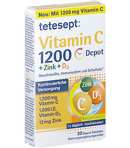 Anwendungsgebiet von Tetesept Vitamin C 1.200mg + Zink+D3 Depot TablettenTetesept Vitamin C 1.200mg + Zink+D3 Depot Tabletten sind ein Nahrungsergänzungsmittel mit hochdosiertem Vitamin C, Zink und Vitamin D3.