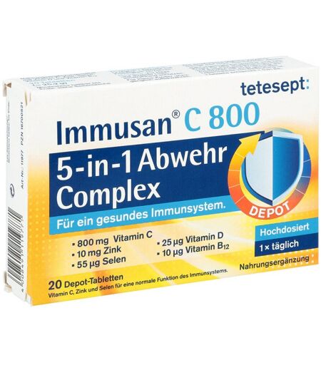 Anwendungsgebiet von Tetesept Immusan C 800 5in1 Abwehr Complex TablettenIn Zeiten erhöhter Ansteckungsgefahr ist die Stärkung des Immunsystems besonders sinnvoll. Das körpereigene Immunsystem ist für die Gesundheit wichtig, denn es hat die Aufgabe, den Körper vor Infekten zu schützen. Tetesept Immusan C 800 5in1 Abwehr Complex Tabletten unterstützen dank ihrer ausgewählten Nährstoffe die Abwehrkräfte. Dank der Depot-Technologie von tetesept kann die Versorgung des Körpers mit Nährstoffen gleichmäßig und über mehrere Stunden erfolgen. So reicht bereits eine Tablette pro Tag aus, um das Immunsystem zu unterstützen, wenn es besonders gefordert ist. Tetesept Immusan C 800 5in1 Abwehr Complex Tabletten enthalten für die Unterstützung der Abwehrkräfte relevanten Nährstoffe in hoher Dosierung: