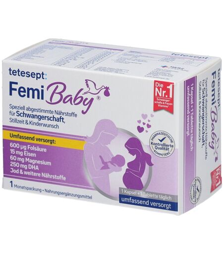 Nahrungsergänzungsmittel sind kein Ersatz für eine ausgewogene und abwechslungsreiche Ernährung und eine gesunde Lebensweise. Kinderwunsch, Schwangerschaft und Stillzeit führen zu einem erhöhten Nährstoffbedarf. Besonders wichtig für Mutter und Kind ist dabei eine ausreichende Versorgung mit Folsäure und DHA.Die aktuelle Nationale Verzehrstudie (2008) zeigt, dass gerade die Versorgung mit Folsäure, DHA sowie Eisen und Jod bei Frauen häufig nicht optimal ist.tetesept Femi Baby® enthält Folsäure, Eisen, Magnesium, DHA und Jod sowie 11 weitere Vitamine und Mineralstoffe für eine umfassende Versorgung von Frauen mit Kinderwunsch, Schwangeren und Stillenden. Die Konzentration der Inhaltsstoffe entspricht den Empfehlungen der deutschen Gesellschaft für Ernährung.tetesept Femi Baby trägt bei:zum Wachstum des mütterlichen Gewebes während der Schwangerschaft dank Folsäurezur normalen Bildung roter Blutkörperchen und dem Sauerstofftransportim Körper dank Eisenzur normalen Entwicklung des Gehirns und der Sehkraft dank DHA. Hierfür sollten neben der empfohlenen Tagesdosis von Omega-3-Fettsäuren (d.h. 250mg DHA + EPA) täglich 200 mg DHA zugeführt werdenzu einer normalen Produktion von Schilddrüsenhormonen dank JodZutaten (pro 100 g)Fischöl (26,4%); Füllstoff: Mikrokristalline Cellulose; Calciumcarbonat (14,6%); Gelatine; Ascorbinsäure (Vitamin C, 5,4%); Magnesiumoxid (4,8%); Feuchthaltemittel: Glycerin; Trägerstoffe: Mannit (Weizen), Gummi arabicum; Eisenfumarat (2,2%); DL-alpha-Tocopherylacetat (Vitamin E, 0,9%); Überzugsmittel: Hydroxypropylmethylcellulose, Hydroxypropylcellulose; Nicotinamid (Niacin, 0,7%); Maisstärke; Trennmittel: Magnesiumsalze der Speisefettsäuren; Calciumpantothenat (0,3%); Pyridoxinhydrochlorid (Vitamin B6, 0,1%); Riboflavin (Vitamin B2, 0,1%); Thiaminmononitrat (Vitamin B1, 0,1%); Pteroylmonoglutaminsäure (Folsäure, 0,03%); Kaliumjodat (0,01%); Biotin (0,003%); Cholecalciferol (Vitamin D, 0,001%); Cyanocobalamin (Vitamin B12, 0,0002%); Saccharose; Öl pflanzlich (Kokosnuss, Palmkern); Trennmittel: Talkum, Speisefettsäuren; Farbstoffe: Titandioxid, Carmoisin, Eisenoxid gelbNährstoffTagesdosis (1 Tablette)% NRV*Vitamin B11,2 mg109%Vitamin B21,6 mg114%Vitamin B61,9 mg136%Vitamin B123,5 µg140%Biotin60 µg120%Vitamin C110 mg138%Vitamin D20 µg400%Vitamin E13 mg108%Folsäure600 µg300%Niacin15 mg94%Pantothensäure6 mg100%Calcium120 mg15%Magnesium60 mg16%Jod150 µg100%Eisen15 mg107%Omega-3-Fettsäuren aus Seefischöldavon DHA250 mg**EPA40 mg** * Anteil der Referenzwerte für die tägliche Zufuhr gemäß Europäischer Lebensmittelinformationsverordnung (LMIV), NRV=Nutrient Reference Value** keine Empfehlung nach LMIV vorhandenDosierung und Anwendung:1x täglich 1 Tablette und 1 Kapsel mit Flüssigkeit verzehren.Nahrungsergänzungsmittel mit Vitaminen, Mineralstoffen und Omega-3-Fettsäuren.Hinweis für Diabetiker1 Tagesdosis entspricht < 0,01 BEHinweiseTrocken und nicht über 25°C aufbewahren.Die empfohlene tägliche Verzehrsmenge darf nicht... ...