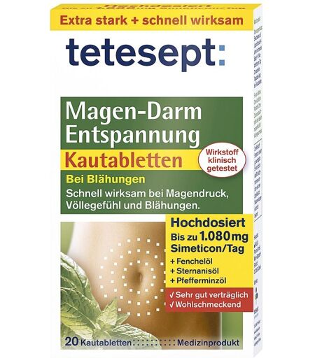 Anwendungsgebiet von Tetesept Magen-Darm Entspannung KautablettenDie Tetesept Magen-Darm Entspannung Kautabletten wirken schnell und zuverlässig bei Beschwerden wie Blähungen, Völlegefühl und Magendruck. Dank ihrer hochdosierten Formel wird der medizinische Wirkstoff bereits beim Kauen im Mund freigesetzt und steht dem Körper somit unmittelbar zur Verfügung. Die Kautabletten unterstützen auf natürliche Weise die Auflösung von Gasansammlungen im Bauchraum – und das mit einem angenehmen Kräutergeschmack.Wirkstoffe / Inhaltsstoffe / ZutatenTetesept Magen-Darm Entspannung Kautabletten enthält:1 Kautablette enthält: Simeticon 135mgSonstige Bestandteile: Glucose, Siliciumdioxid, Magnesiumstearat, Cellulose, Calciumsilikat, Bitterfenchelöl, Sternanisöl, Pfefferminzöl.GegenanzeigenBei bekannter Überempfindlichkeit gegenüber einem der oben genannten Inhaltsstoffe sollte das Produkt nicht angewendet werden.DosierungAnwendungsempfehlung von Tetesept Magen-Darm Entspannung Kautabletten:Erwachsene und Jugendliche ab 14 Jahren nehmen bei Bedarf 1–2 Kautabletten pro Tag. Die maximale Tagesdosis liegt bei 8 Kautabletten.HinweiseWichtige Information:Enthält Glucose und Pfefferminzöl. Bitte Packungsbeilage beachten! Nicht über 25°C lagern.Hinweis für Diabetiker: 1 Kautablette entspricht 0,1 BE.Auch für Schwangere und Stillende geeignet.Frei von Laktose. Ohne künstliche Farbstoffe. Ohne Zuckeraustauschstoffe. Kein Gewöhnungseffekt. Mit Kräutergeschmack.Der Wirkstoff Simeticon ist sehr gut verträglich. Er wird nicht in das Blut aufgenommen, sondern wirkt rein physikalisch. Nebenwirkungen sind nicht bekannt.Tetesept Magen-Darm Entspannung Kautabletten können in Ihrer Versandapotheke www.apotheke.at erworben werden. ...