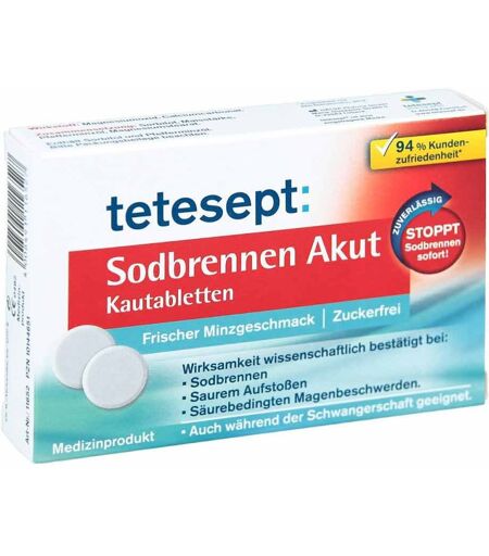 Tetesept Sodbrennen Akut Kautabletten wirken spürbar schnell und effektiv bei Sodbrennen und säurebedingten Magenbeschwerden. Sie sind zuckerfrei und gut verträglich. Mit frischer Pfefferminze.