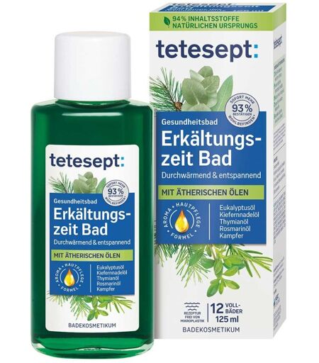 Anwendungsgebiet von Tetesept Erkältungszeit BadDer wohltuende kosmetische Badezusatz Tetesept Erkältungszeit Bad verfügt über einen natürlichen Duft-Effekt für wohltuende Entspannung im warmen Bad. Die spezielle Kombination in Tetesept Erkältungszeit Bad besteht aus Eukalyptusöl, Kiefernnadelöl, Thymianöl, Rosmarinöl und wird durch Kampfer ergänzt. In Verbindung mit warmen Badewasser entfalten die ätherischen Öle ihre positiven Eigenschaften. Die sanft schäumende Rezeptur mit ihren hautpflegenden Substanzen reinigt die Haut sanft und verleiht ihr ein gepflegtes Gefühl.Wirkstoffe / Inhaltsstoffe / ZutatenTetesept Erkältungszeit Bad enthält:Aqua, Cocamidopropyl Betaine, Lauryl Glucoside, Sodium Cocoyl Glutamate, Polyglyceryl-3 Caprate/Caprylate/Succinate, Parfum, Eucalyptus Globulus Leaf Oil, Camphor, Pinus Sylvestris Leaf Oil, Rosmarinus Officinalis Leaf Oil, Thymus Vulgaris Oil, Propylene Glycol, Xanthan Gum, Citric Acid, Potassium Sorbate, Sodium Benzoate, Limonene, Ci 42051, Ci 47005.GegenanzeigenBei bekannter Überempfindlichkeit gegenüber einen der oben genannten Inhaltsstoffe sollte das Produkt nicht angewendet werden.DosierungAnwendungsempfehlung von Tetesept Erkältungszeit Bad:Dosierung: ca. 1 Verschlusskappe (10 ml) pro VollbadWassertemperatur: 35–38°CBadedauer: 10–15 MinutenHäufigkeit: bei Bedarf täglichTipp: nach dem Bad warm einwickeln & ruhenSchwangerschaftNicht während der Schwangerschaft und Stillzeit anwenden.HinweiseErwachsenenbad. Für Kinder unzugänglich aufbewahren. Nur auf intakter Haut anwenden.Tetesept Erkältungszeit Bad können in Ihrer Versandapotheke www.apotheke.at erworben werden. ...