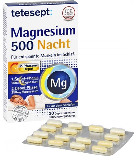 Unsere Muskeln und Nerven werden aufgrund besonderer Herausforderungen in Sport, Beruf und Alltag täglich in hohem Maße beansprucht. In der Nacht sind entspannte Muskeln, sowie innere Ruhe jedoch eine wichtige Voraussetzung für erholsamen Schlaf. Eine ausreichende Versorgung mit Nährstoffen kann helfen, den menschlichen Organismus zu unterstützen.Wirkungsweise von Tetesept Magnesium 500 Nacht TablettenDurch das 2-Phasen-Depot wird eine Versorgung mit Magnesium über mehrere Stunden gewährleistet.